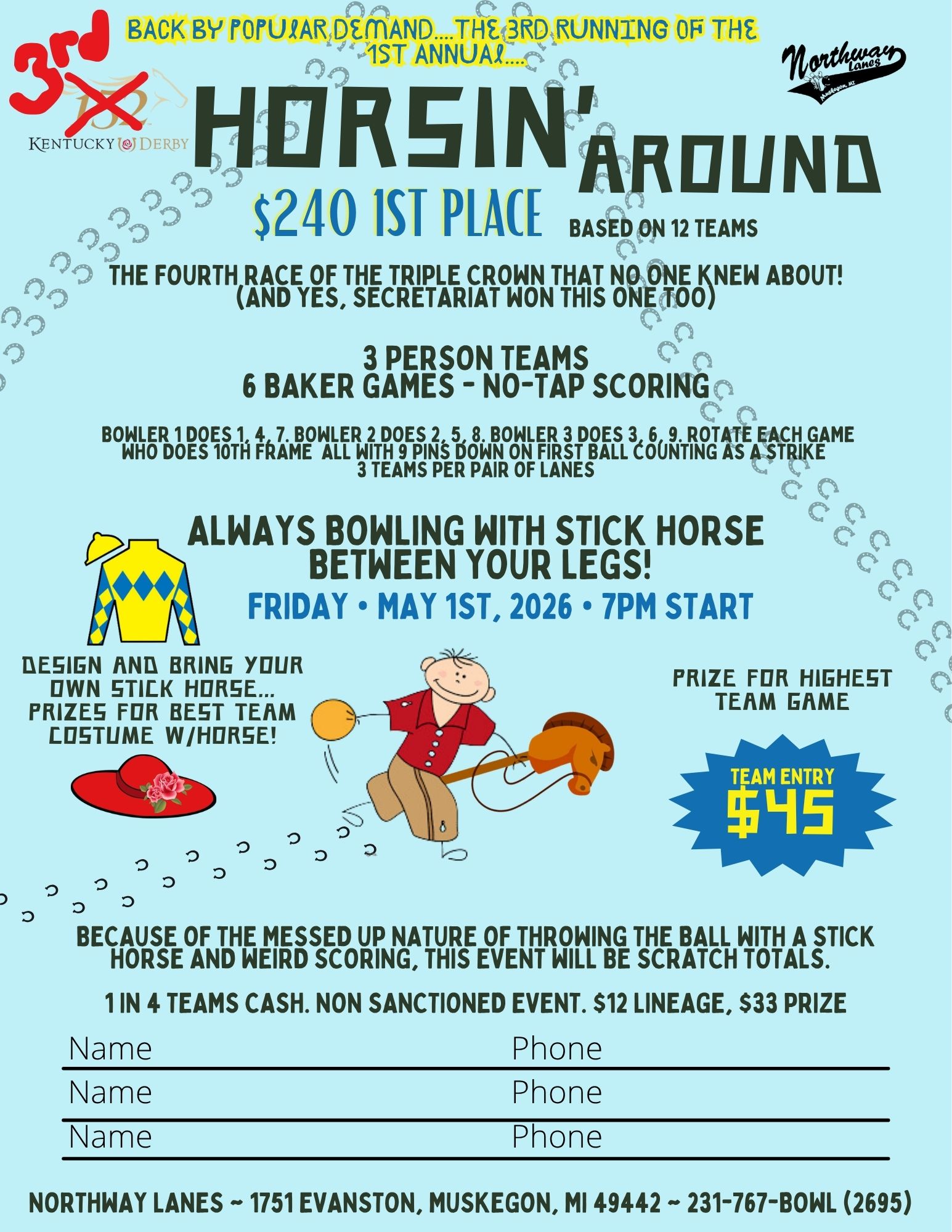 This has been quoted as “the most fun you can have in a bowling center with your clothes on” by THE Mr. Ted Boltz himself. One of the more quirky and fun events bowling has to offer, 3 person teams bowl baker games all while having a stick horse between your legs.