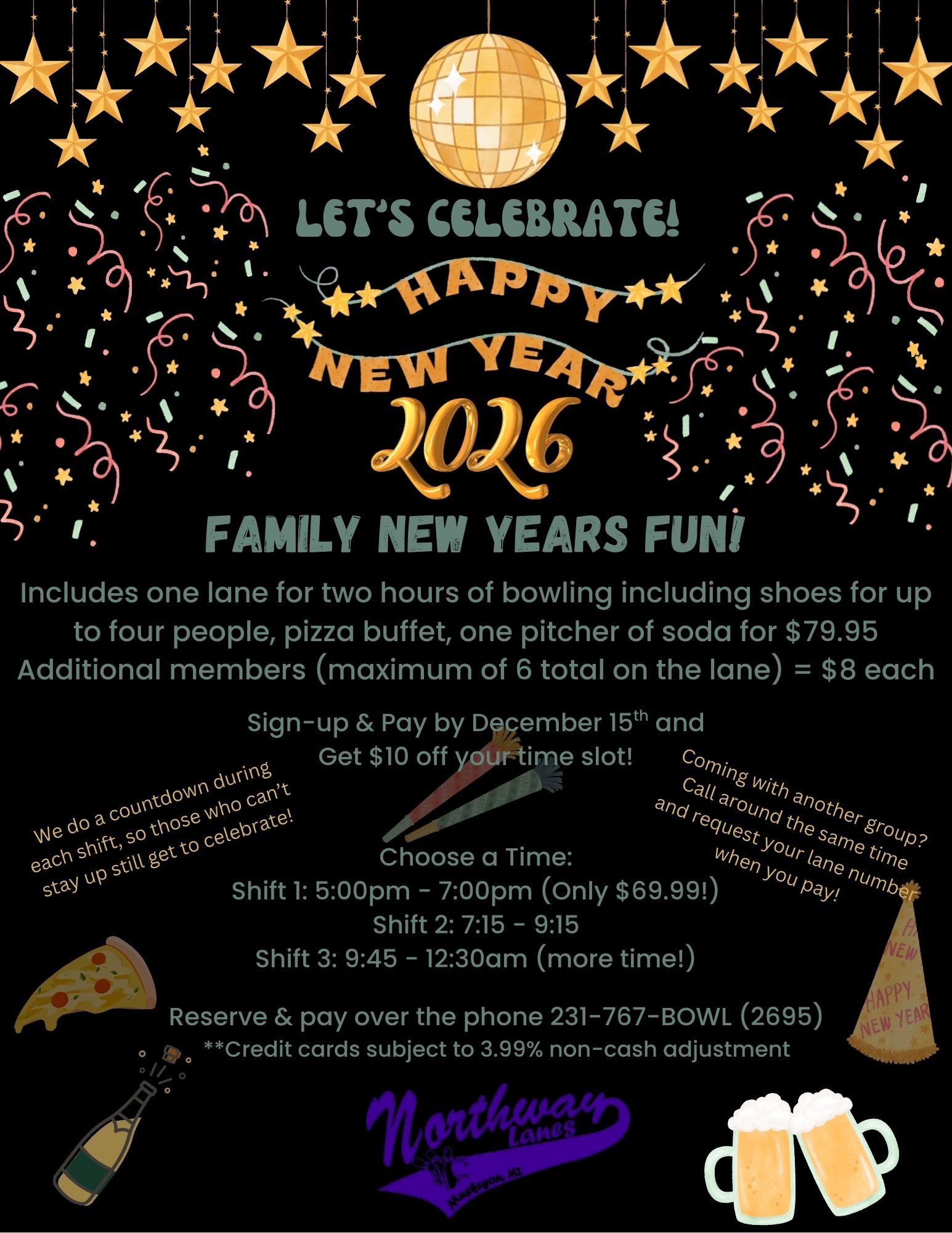 If your family is looking for something fun to do in Muskegon this New Years Eve look no further. Northway has the casual event you’re looking for. All you can bowl, Pizza buffet, pitcher of soda and all the fun your family can handle for just $79.95 for a group of 4! Extra guests just $8 per person with a maximum of 6 people per lane. Have multiple groups coming? Call us at near the same times to reserve your group together by requesting lane numbers. We cannot move people to accommodate your group so please make sure you know the lane you requested.