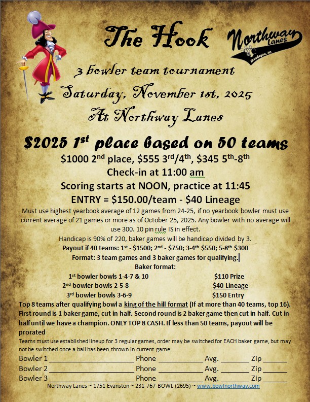 Get your team together for the fast paced 3-person team event that is full of fun! Named after its founder Dave Vanderhoek (Former owner of Starlite Lanes in Grand Haven), the tournament pays $500 first place based on 20 teams. If it sells out (50 teams) like it did during the last few years, 1st place is $2025! Bowling starts at noon and features qualifying consisting of 3 regular games and 3 baker games. The top 8 teams move on (above 40 teams we make it the top 16) to 1 game king of the hill baker games. Get signed up soon for The Hook!