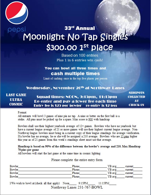 Here is a fun bowling tournament in Muskegon the night before Thanksgiving. Knock 9 down on your first ball and get a strike! $300 1st place.
